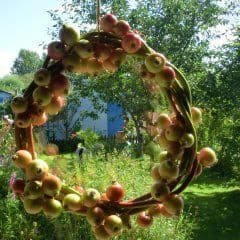 Wir haben den Kranz von beiden Seiten mit Zieräpfeln geschmückt, um ihn ins Fenster hängen zu können.